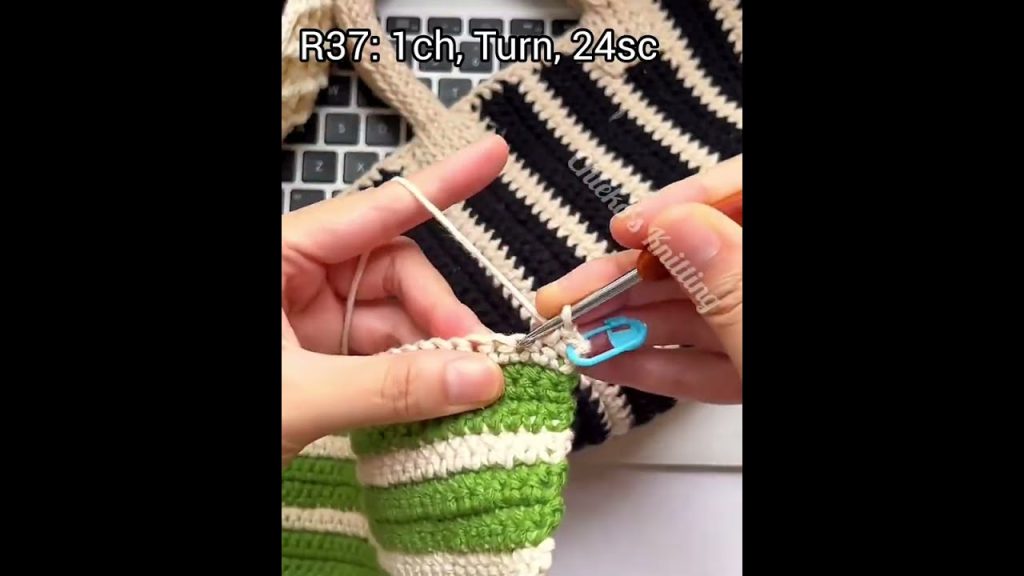 - When you reach the top of the bag, chain 25–30 stitches (for one handle).
